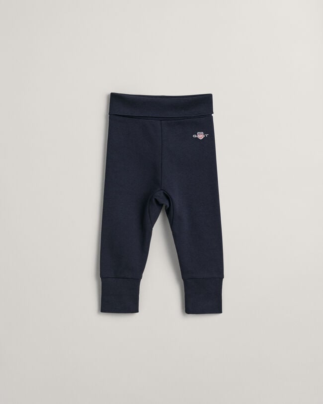 Crafted from 100% organic cotton in a soft interlock quality, these regular fit, unisex leggings are perfect for active little ones. Made for ultimate comfort and mobility, these leggings feature leg cuffs and a waistband that can be extended or folded for an adjustable fit. They are complete with a small-scale shield graphic embroidered at the left leg.