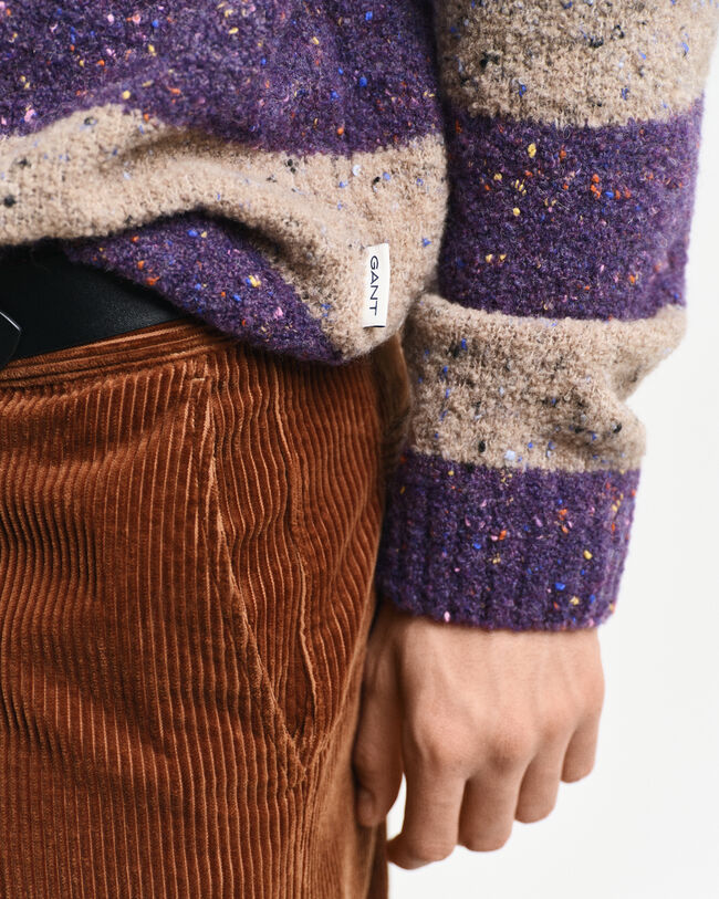 A knitted take on our classic rugger, this version is designed from a multi-colored Italian bouclé wool-blend yarn. Sporting an all-over barstripe design, this rugger features a polo collar with corozo buttons. It is finished with fully-fashioned detailing and rib endings at the hem and cuffs. This garment is intended for a relaxed fit. For a closer fit, we recommend sizing down.