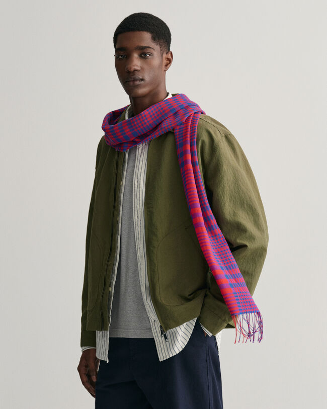 Crafted from 100% merino wool, this woven scarf is adorned with an all-over jacquard checked pattern and features fringed detailing at the edge of the design. The scarf is further detailed with a tonal GANT logo embroidered at the bottom edge.
