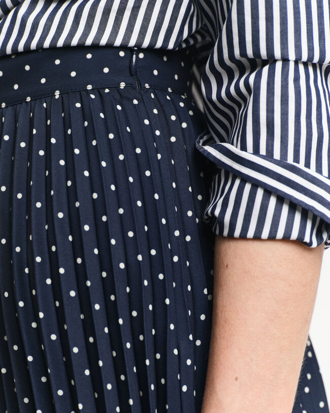 Cut with a mid-rise waist and a midi length that hits at the calf, this pleated skirt is simply elegant. Crafted from recycled polyester to keep the pleats in place, the design features an all-over dotted print pattern, a concealed side zip and hook-and-eye closure.