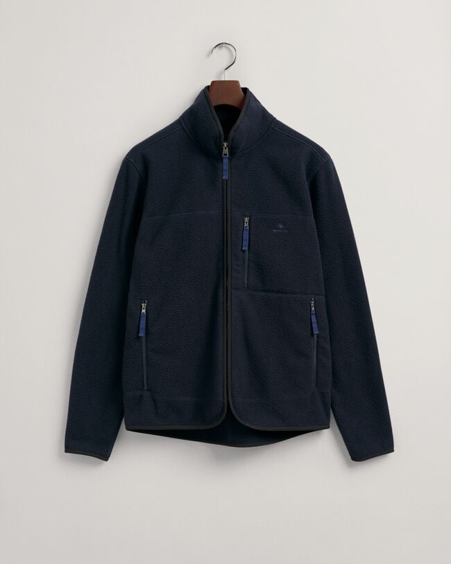 Ideal for weekend strolls this fall, our Fleece Jacket is made of recycled polyester spun into a plush and warm fleece. Elastic binding on the hem, cuff and front zip offset the fuzz with technical sharpness. Featuring three zip pockets, a full zip front and an elbow patch, it is complete with subtle GANT branding embroidered at the chest in a tonal color.