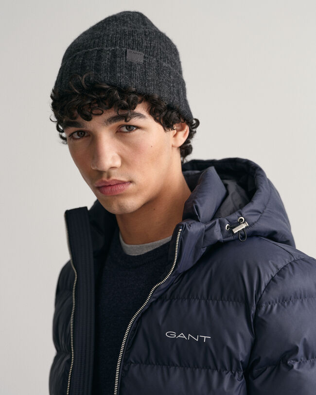 This fluffy, wool-blend beanie is designed in a flat knit and constructed for a short-top fit. It features a ribbed fold up with a leather debossed GANT label stitched at the upper corner.