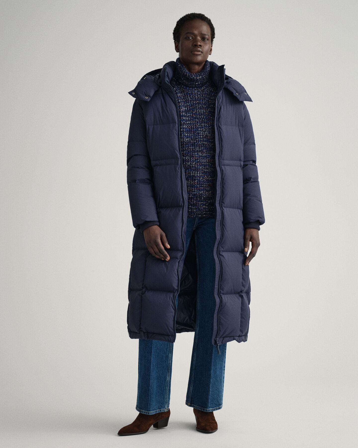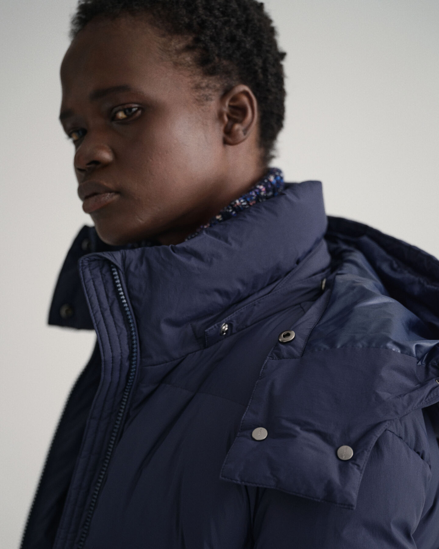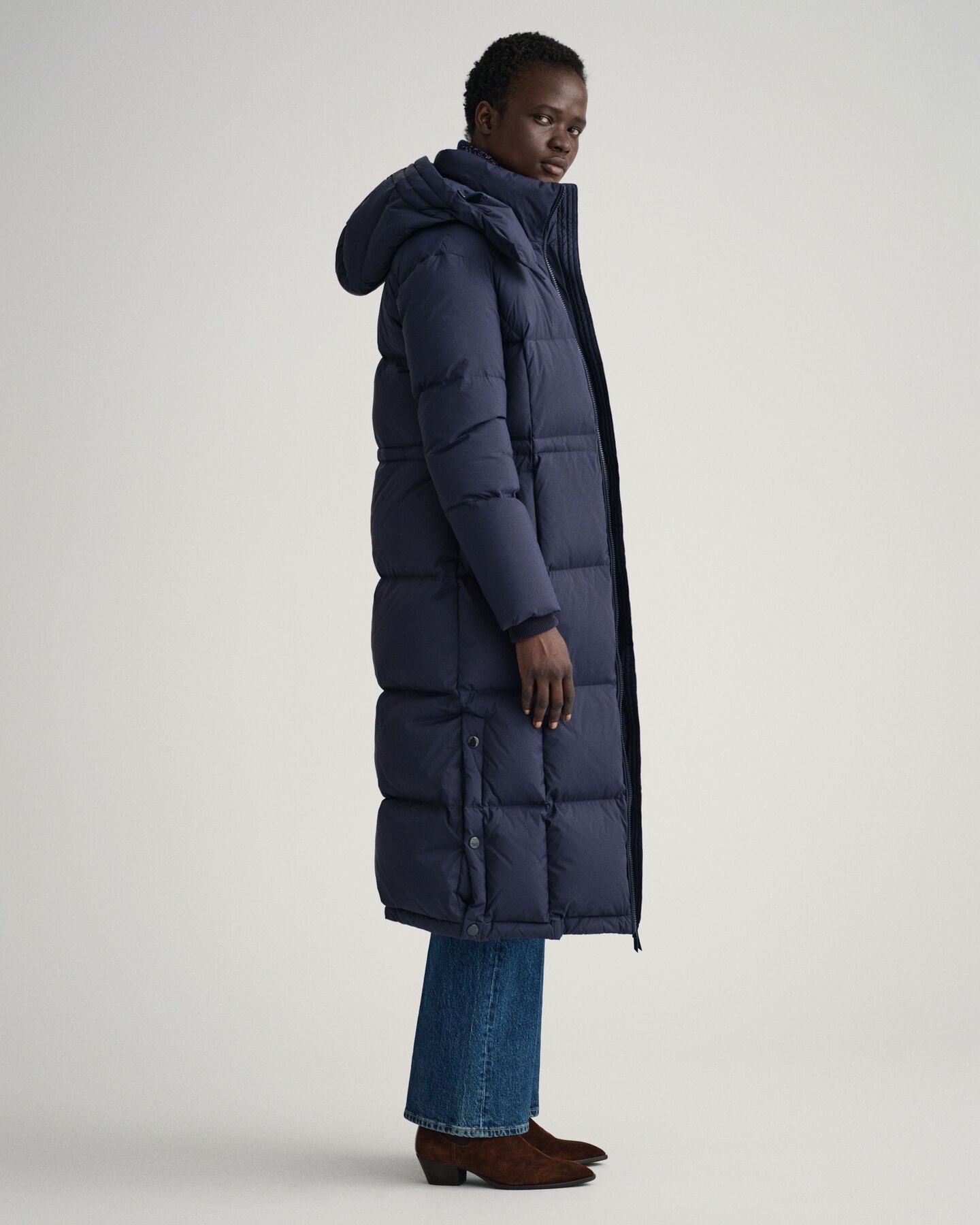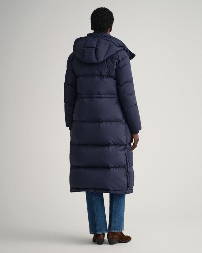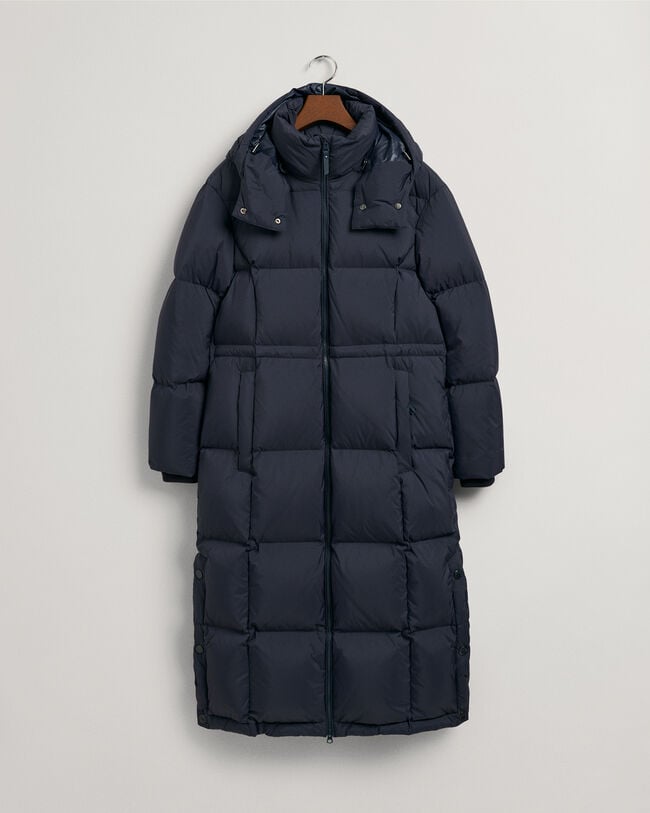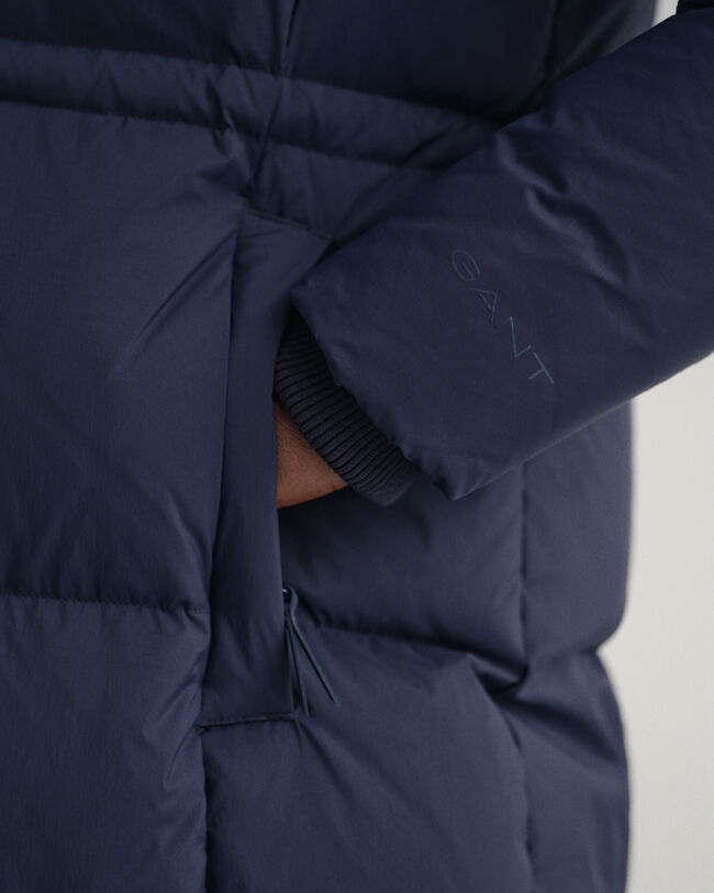 Crafted in recycled nylon with recycled polyester lining, this water-resistant coat is padded with 90% certified down, 10% feathers for ultimate winter warmth. Hitting the mid calf with snap closures at the side hem for an adjustable fit, this long coat is in a regular fit that's easy to layer under, and features a removable hood, a drawcord at the waist, knit ribs at the cuffs, two outer zip pockets, and a printed logo at the cuff for a sporty look.