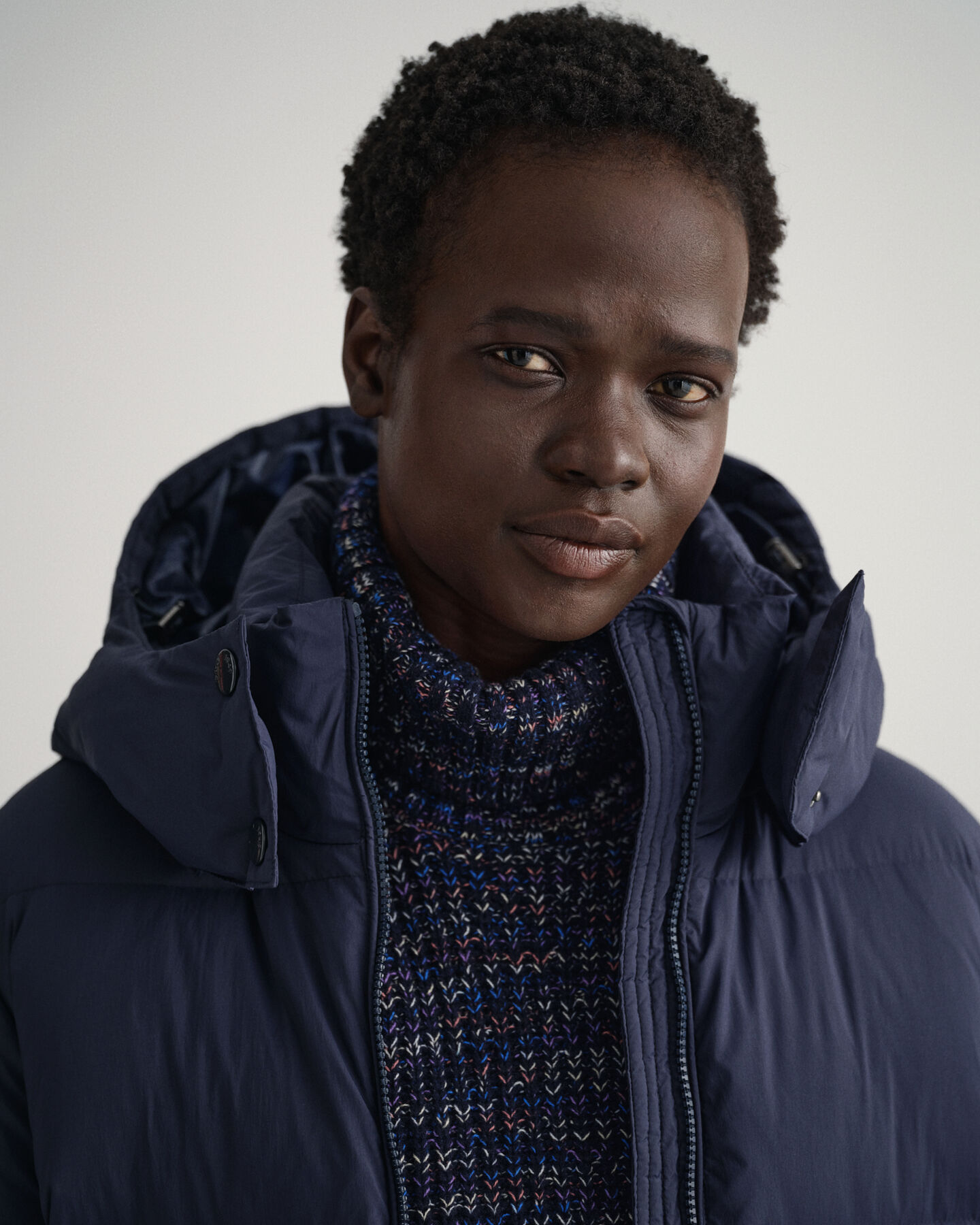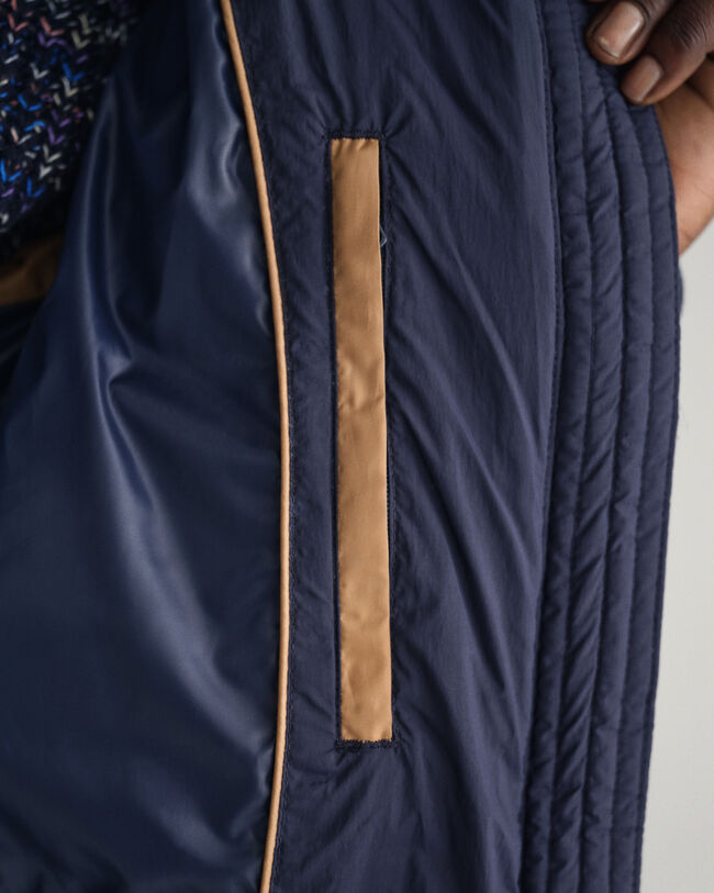 This product has sustainability attributes in all layers: shell, lining and padding. The shell and lining are made with recycled synthetics and the padding is made with certified down and feathers.