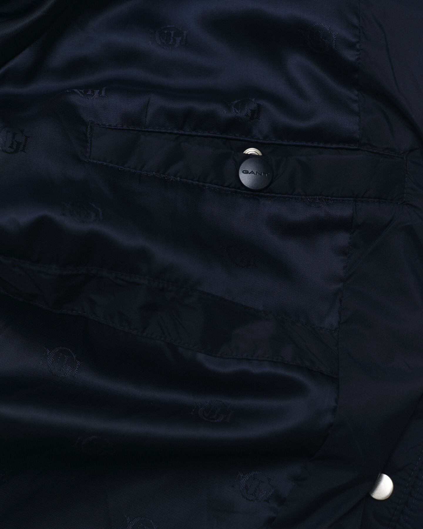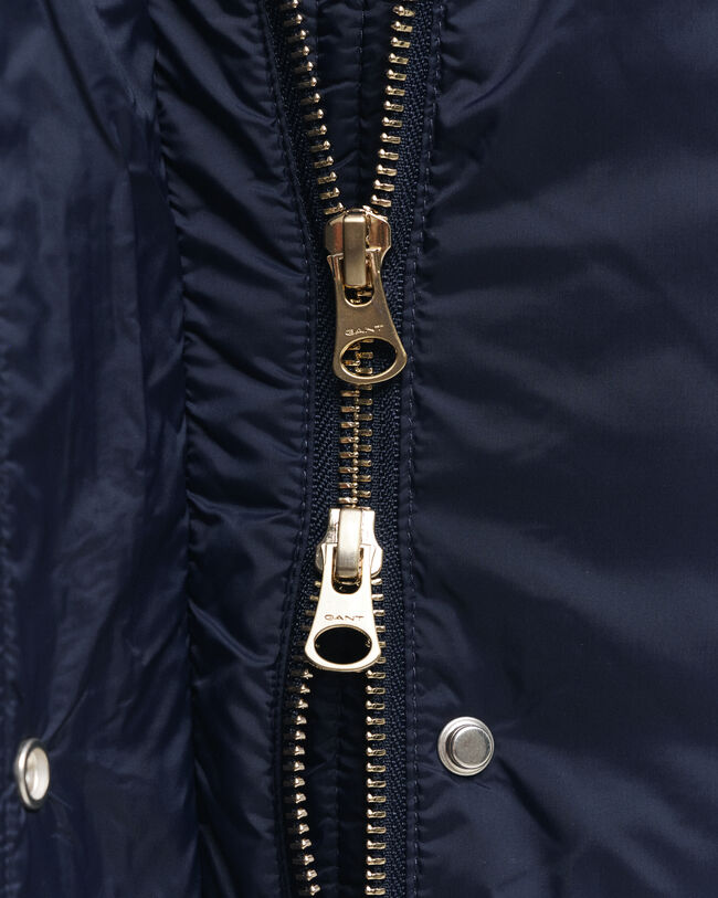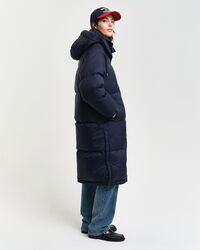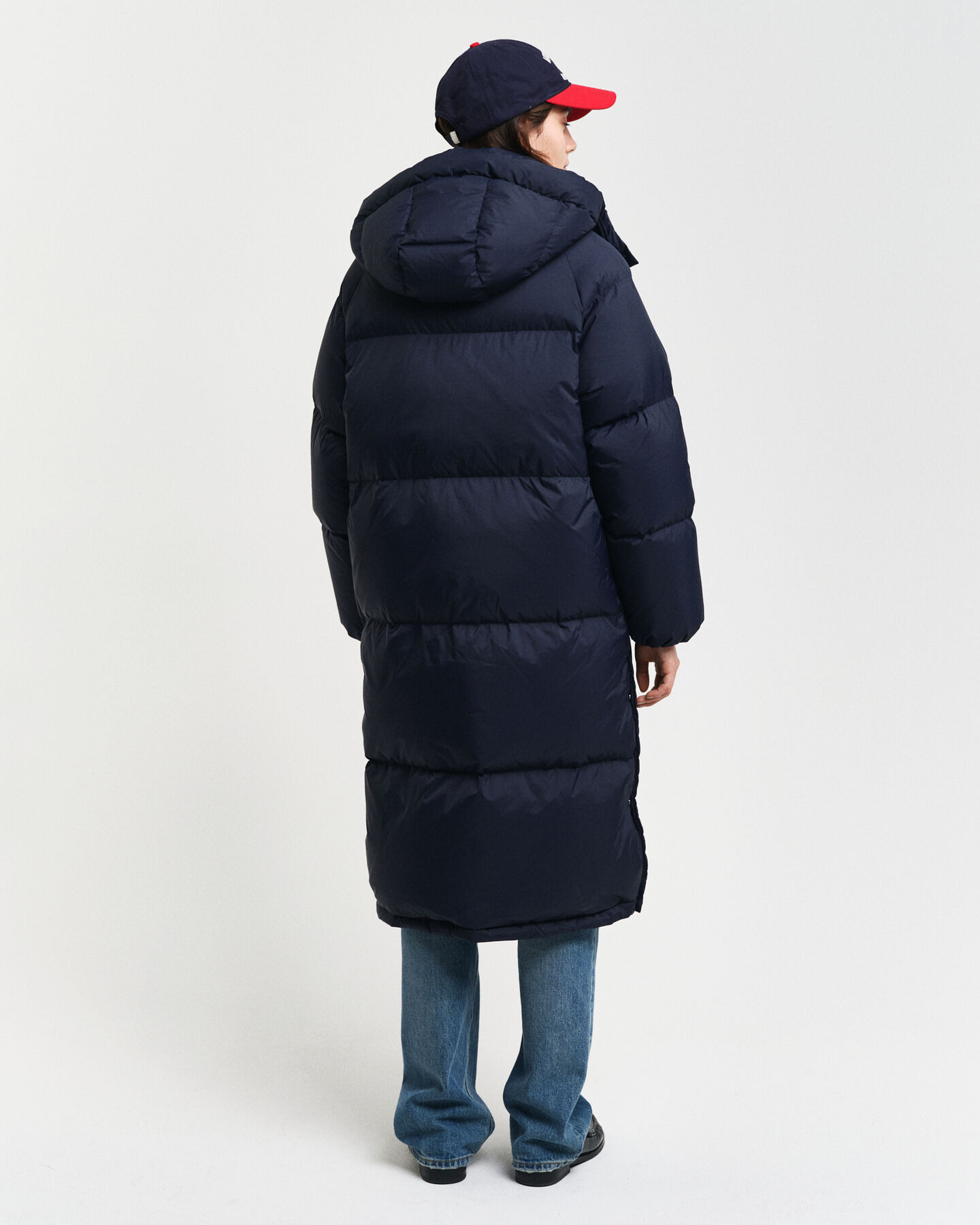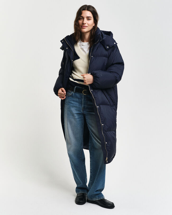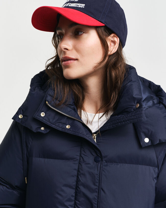 Pared-back and practical, this quilted coat is made from a recycled and lightweight synthetic with a matte surface and water-repellent finish. Filled with 90% down and 10% feathers for a super soft cocooning warmth, this coat has a relaxed fit that falls at the lower calves. Design features include logo snap buttons, an interior pocket, a double-ended front zip and two front welt pockets. Other functionalities include a removable and adjustable hood, raglan sleeves with elastic cuffs and a drawcord at the waist for a shaped fit. This coat is complete with jacquard logo lining and a rubber GANT logo printed at the sleeve. This garment is intended for a relaxed fit. For a closer fit, we recommend sizing down. This coat features a Durable Water Repellent (DWR) treatment which will help to shed water in light weather conditions. If you’re unexpectedly caught in a downpour, please follow the care instructions closely to restore the performance and prolong the life of this garment. It features a 650-fill-power down and has heavy insulation.