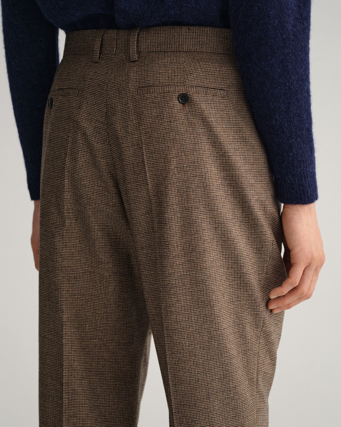 Tailored in an Italian wool blend with a houndstooth check pattern, these suit pants have a relaxed fit with a mid-rise and tapered leg. They have a double pleated front with press creasing, an extended waistband, side pockets and back buttoned welt pockets. Pair with the matching blazer for a full suit, or wear as a separate with a crisp button-down (or even in a tucked-in tee) for a more casual take.