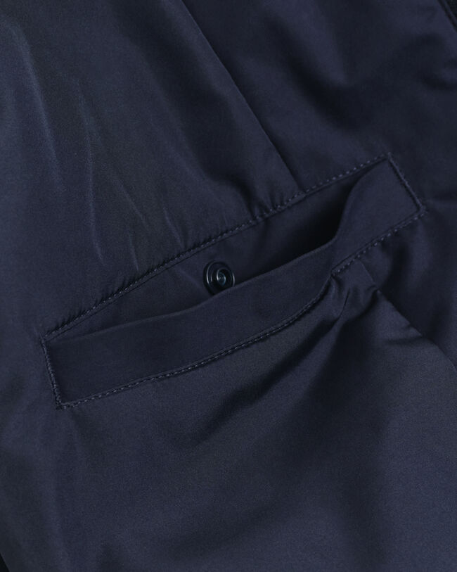 This Padded Hampshire Jacket is a transeasonal outerwear essential. Designed for a regular fit and finishing just above the hips, it's crafted from a recycled polyester-cotton blend and features a water-repellent finish. Fully lined, this jacket has a stand collar with ribbed lining, a front zip closure, side welt pockets, two interior pockets, rib endings, logo embroidery at the chest, and our signature locker loop at the back. This jacket features a Durable Water Repellent (DWR) treatment which will help to shed water in light weather conditions. If you’re unexpectedly caught in a downpour, please follow the care instructions closely to restore the performance and prolong the life of this garment.