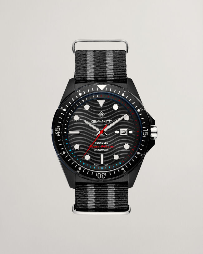 Sporty and classic, our men's time collection combines innovation with superior craftsmanship to create keepsakes inspired by our Never Stop Learning credo. The R.O.P Wristwatch is made in recycled ocean plastic with a nato strap and features three hands and a date function.