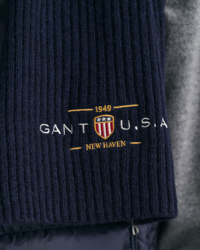 Presented in a box for easy gifting, this set features a matching scarf and beanie crafted in a cozy wool blend. Designed in a rib knitted structure, it features our seasonal GANT logo shield embroidery at the scarf hem and beanie fold up.