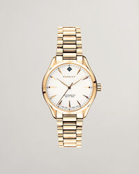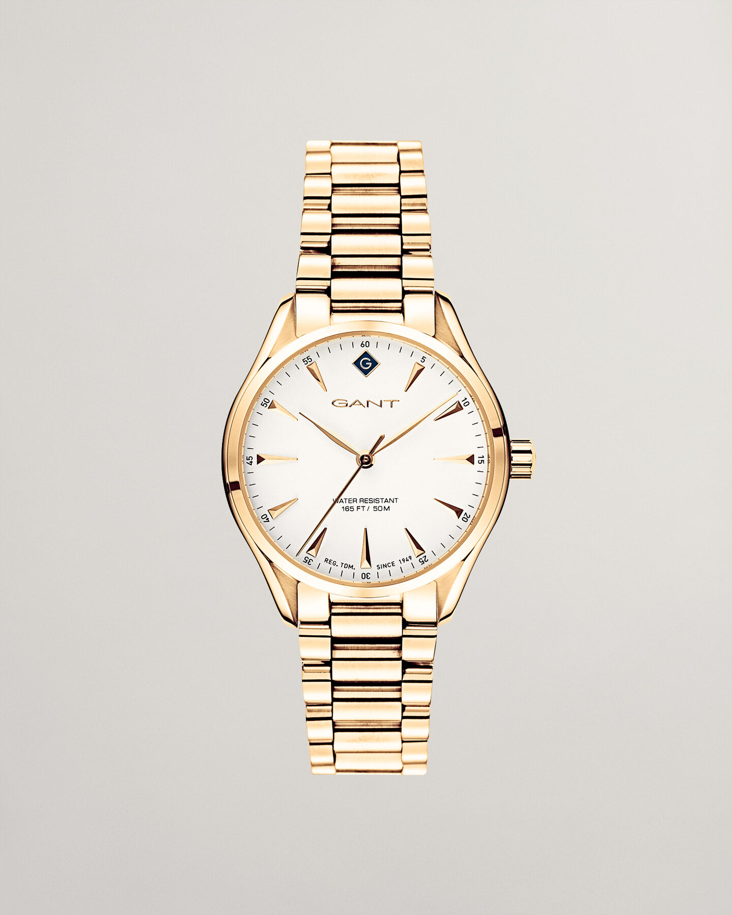 A GANT watch is more than an accessory. Using luxe materials, we've crafted a women's collection in tribute to our history of iconic American sportswear. The Sharon Wristwatch is crafted in stainless steel with gold ion plating and mineral glass, and features three hands.