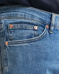 Designed in a clean indigo wash, these jeans are the perfect addition to any seasonal wardrobe. Cut for a slim fit, they have a mid-rise waist and a slim, tapered leg. Made with a classic 5-pocket design and zip fly front, these jeans feature branded shank buttons and rivets as well as a leather logo patch at the back waistband.