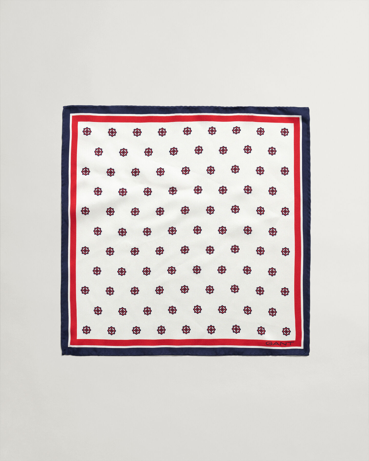 This silk pocket square adds flair to your work wardrobe, and features a nautical-inspired steering wheel pattern framed by a solid border.