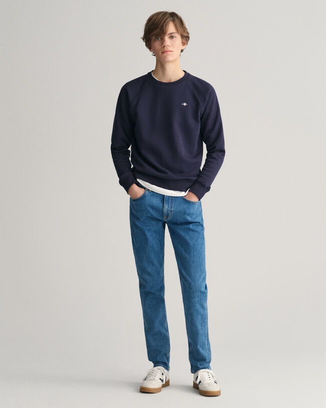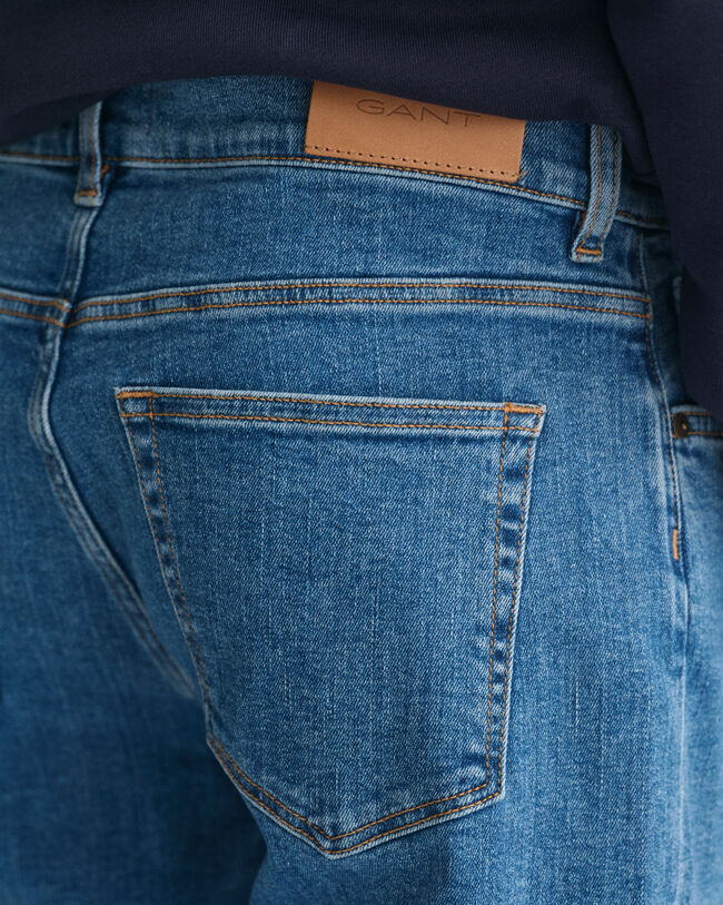 Crafted in cotton with a touch of stretch, these jeans for teen boys are cut for a slim fit with a mid-rise waist. A wardrobe essential, they feature an adjustable elastic at the waist, a zip fly and a logo patch at the back waistband.