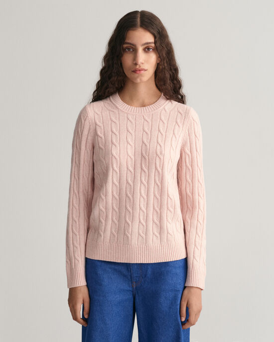 Stretch Cotton Cable Knit Crew Neck Sweater